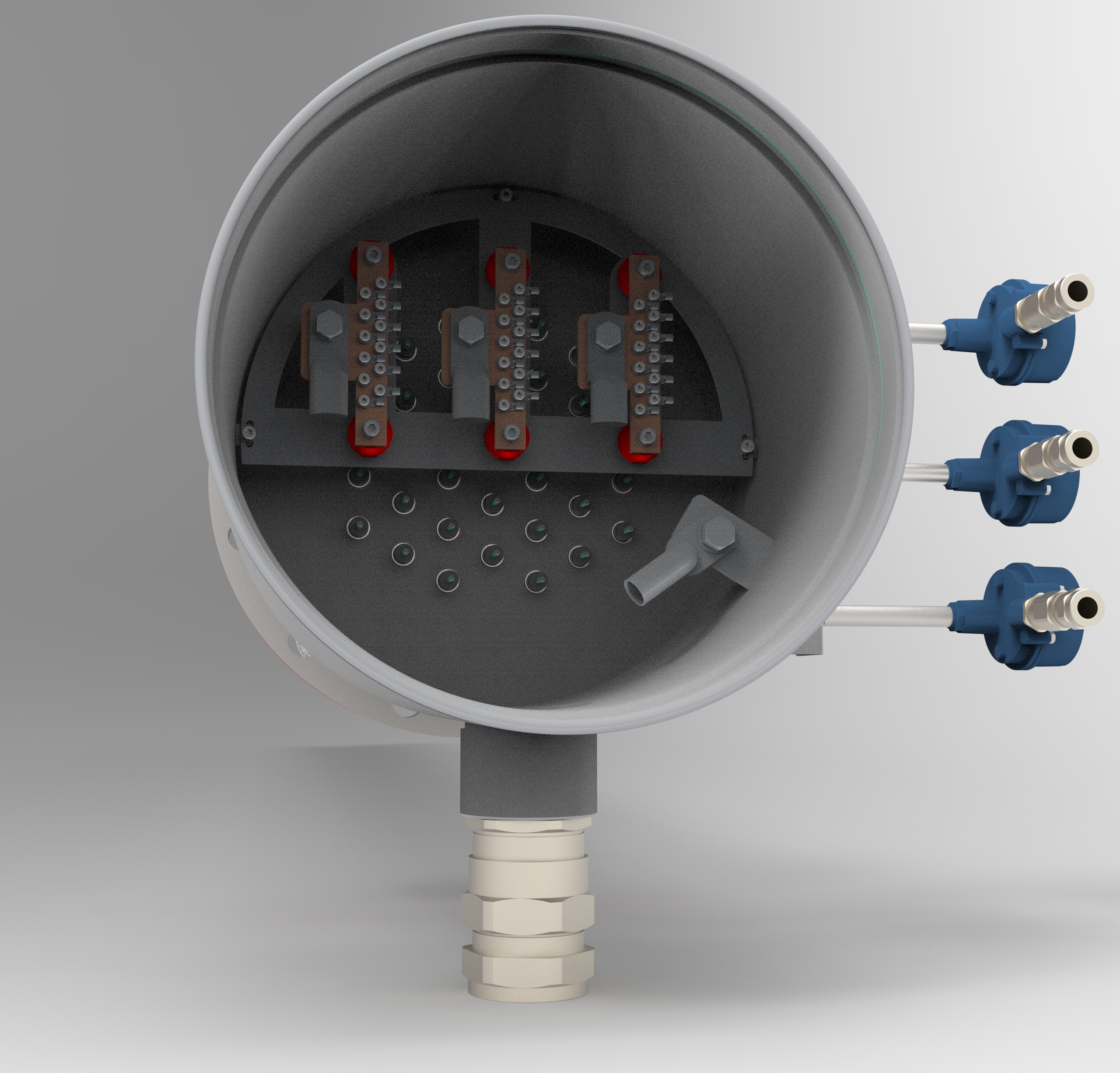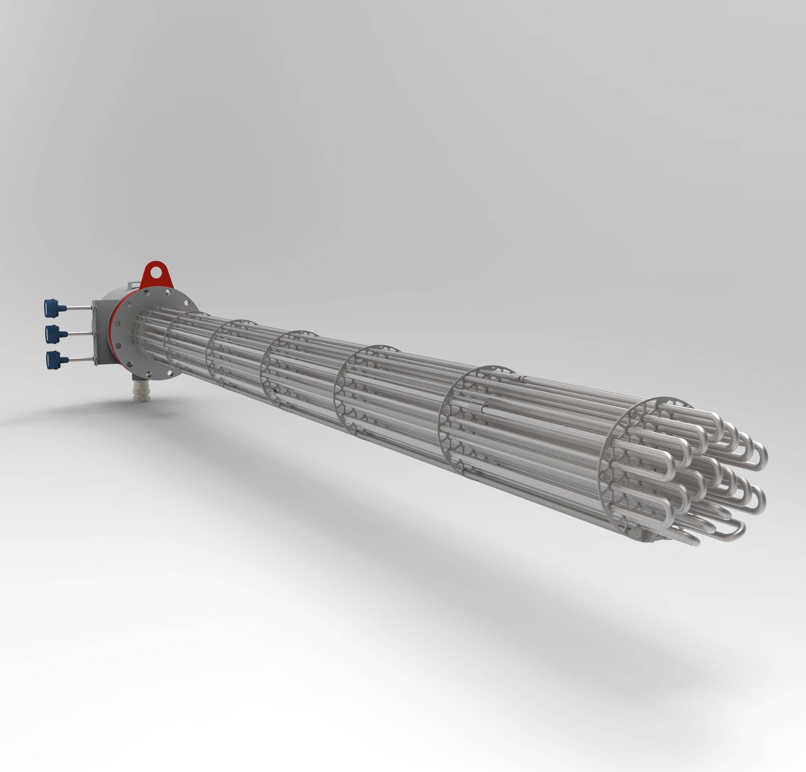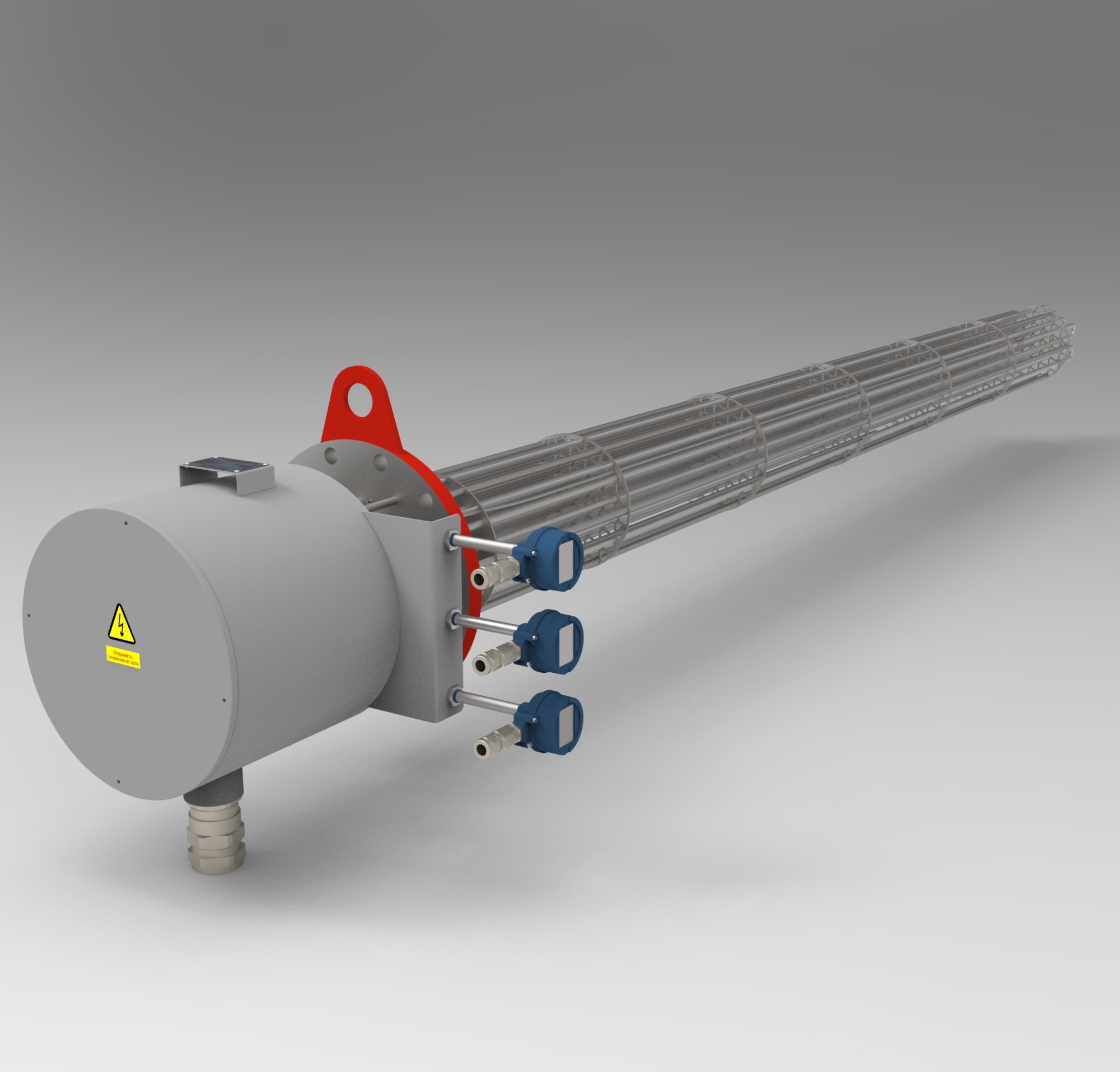 Нагревательные элементы выполнены из бесшовных трубок увеличенной толщины (1,2мм). Внутри коробки находятся силовые шины для подключения питающего кабеля Заказчика. На вынесенном кронштейне коробки расположены датчики температуры (тип К) пучка нагревательных элементов. На поверхности коробки расположены кабельные ввода, под силовой бронированный кабель Заказчика.