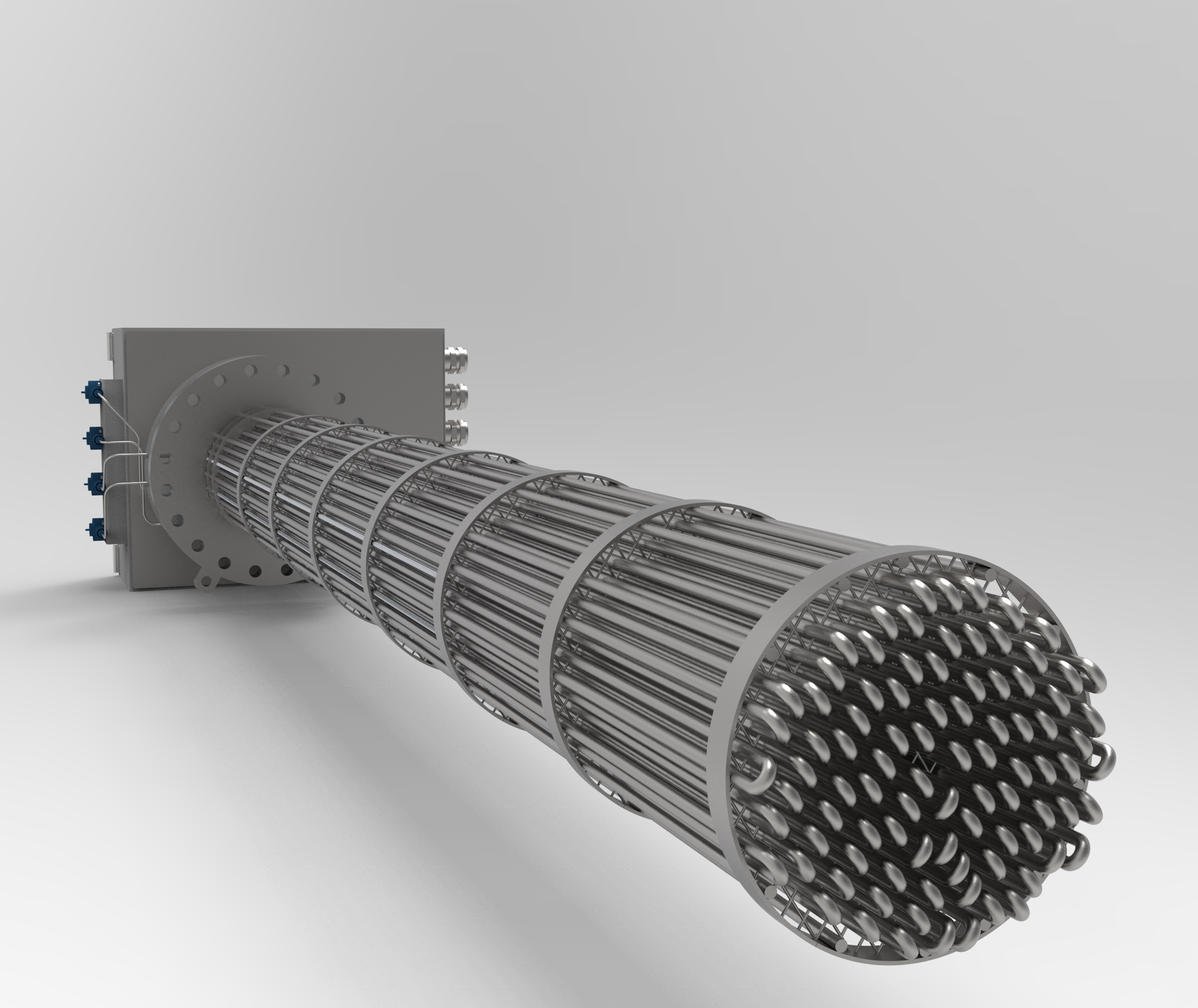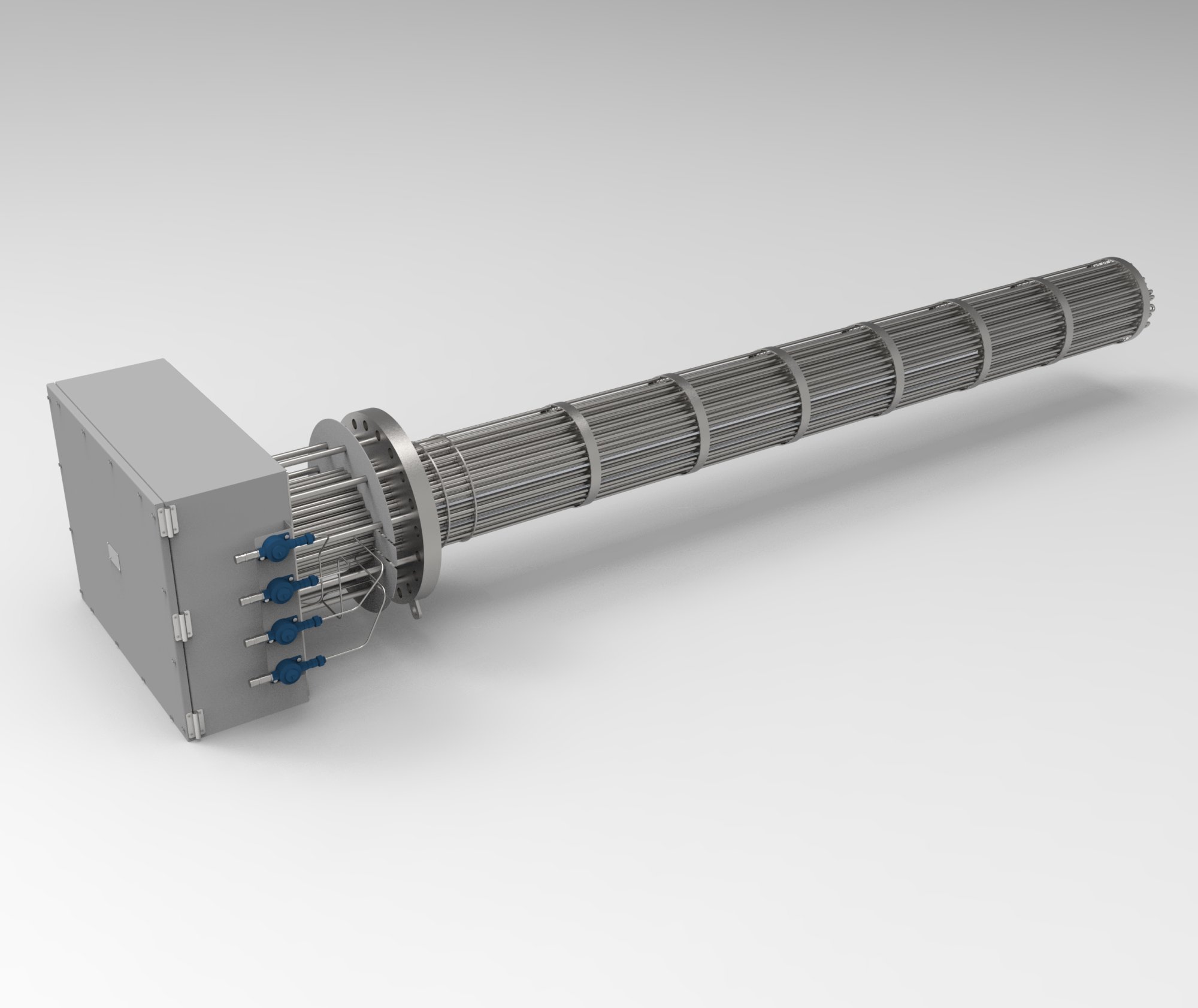 Нагреватель состоит из пучка нагревательных элементов приваренных к присоединительному фланцу методом АДС сварки.