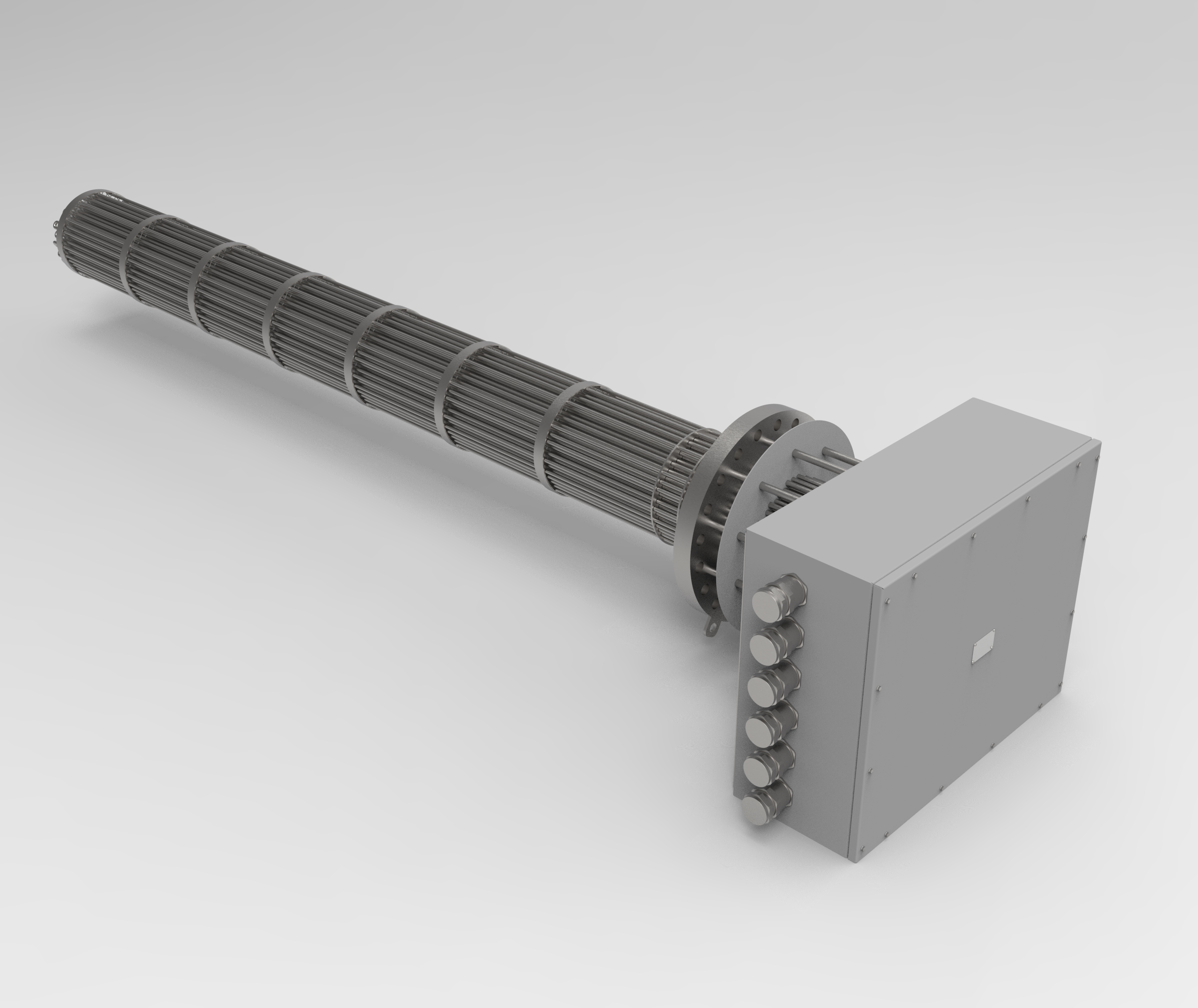 Нагревательные элементы выполнены из бесшовных трубок увеличенной толщины (1,2мм). Клеммная коробка, крышка, петли коробки и фланец выполнены из нержавеющей стали. Внутри коробки находятся силовые медные шины для подключения питающего кабеля Заказчика. На вынесенном кронштейне коробки расположены датчики температуры (тип К) пучка нагревательных элементов.