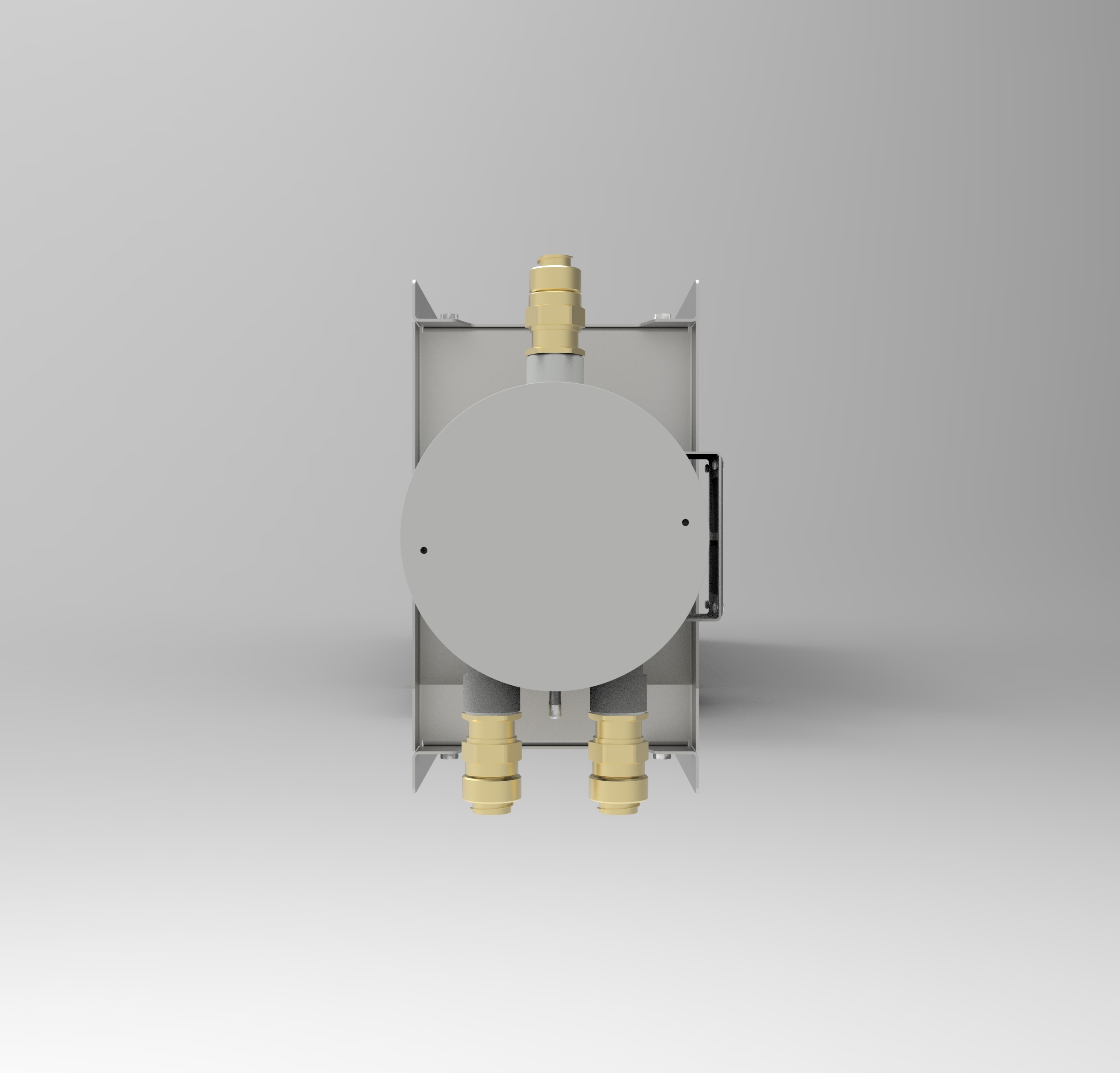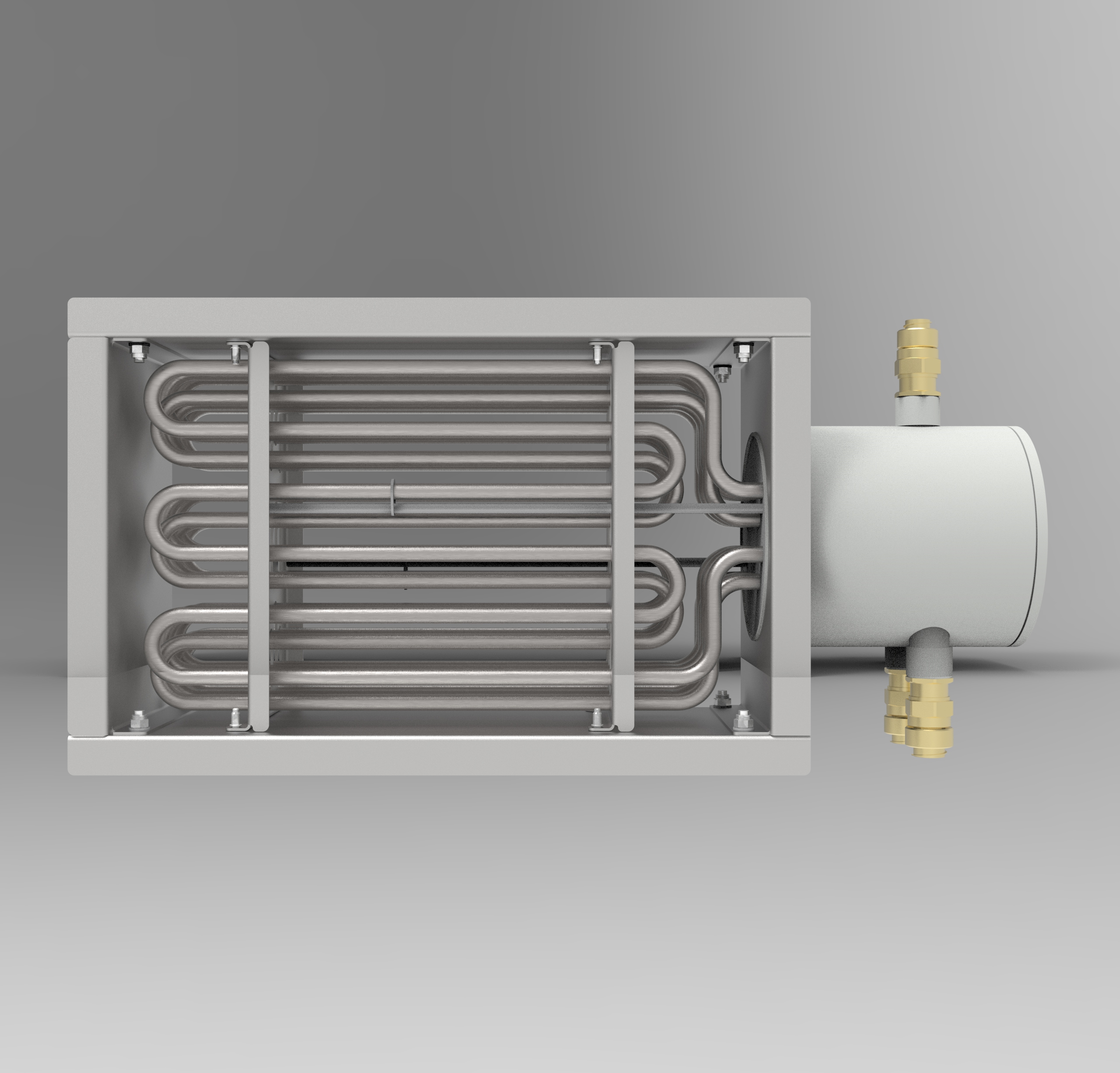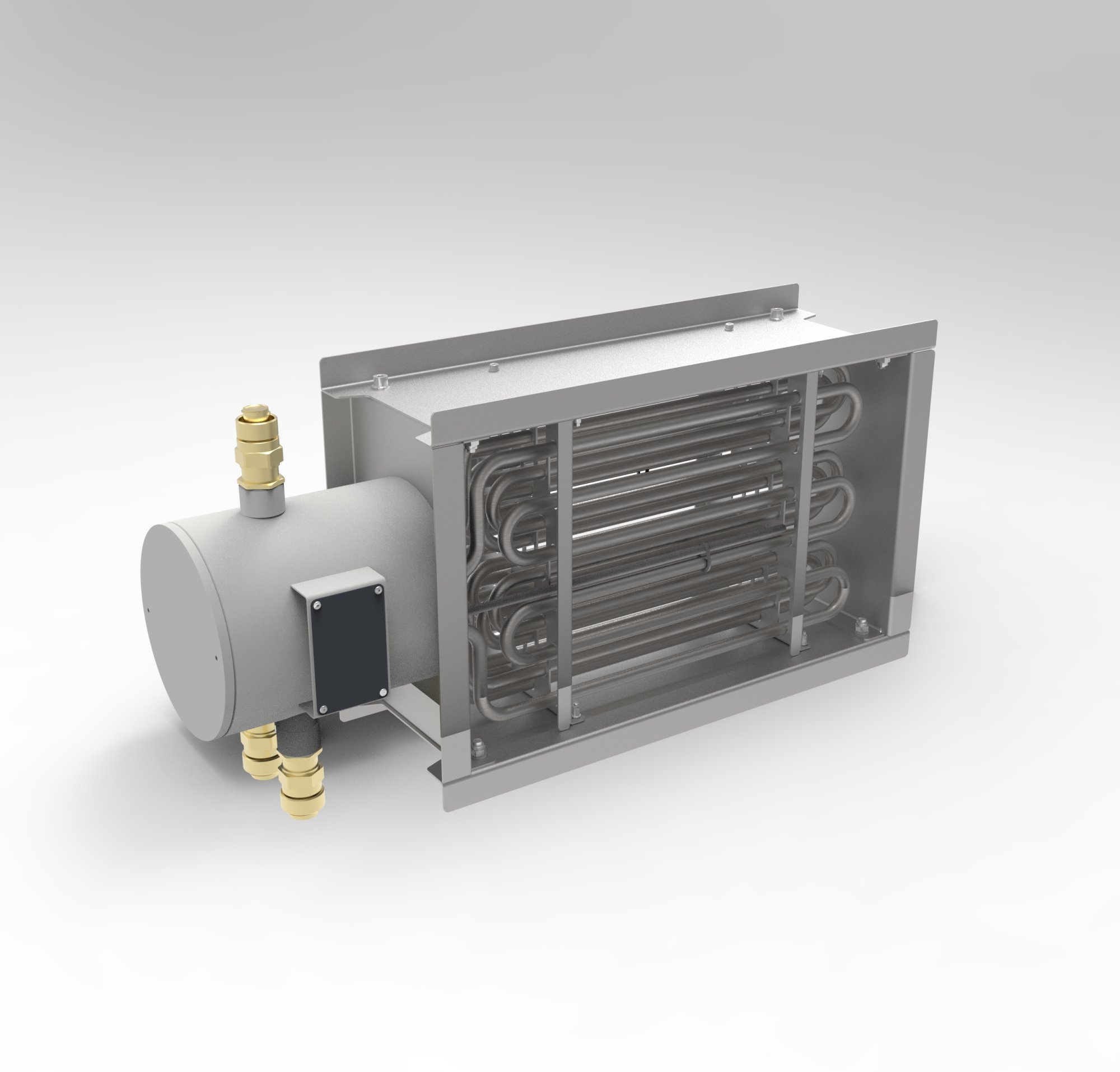 Конструктивно канальный взрывозащищенный нагреватель представляет собой связку трубчатых нагревательных элементов, размещенных на присоединительном фланце, которая помещена в воздуховод прямоугольного сечения. Мощность нагревателя разделена на 2 группы по 7.5кВт. На боковой стороне нагревателя расположена клеммная коробка. Крепление крышки коробки резьбовое.Для присоединения силового кабеля Заказчика внутри коробку расположены силовые клеммы.
